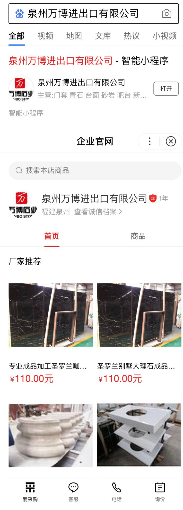 現在,只要在百度APP首頁搜索“泉州萬博進出口有限公司”,第一頁第一條就可以看到該公司的企業智能小程序,點擊即可跳轉公司店鋪與相關產品。店鋪上方可查看企業誠信檔案,增強買家信任;特有店鋪商品頁展現樣式,方便客戶瀏覽線索;下方轉化組件可通過IM溝通、撥打電話、詢價表單等方式直接與客戶建立聯系,促進買賣雙方交易達成。